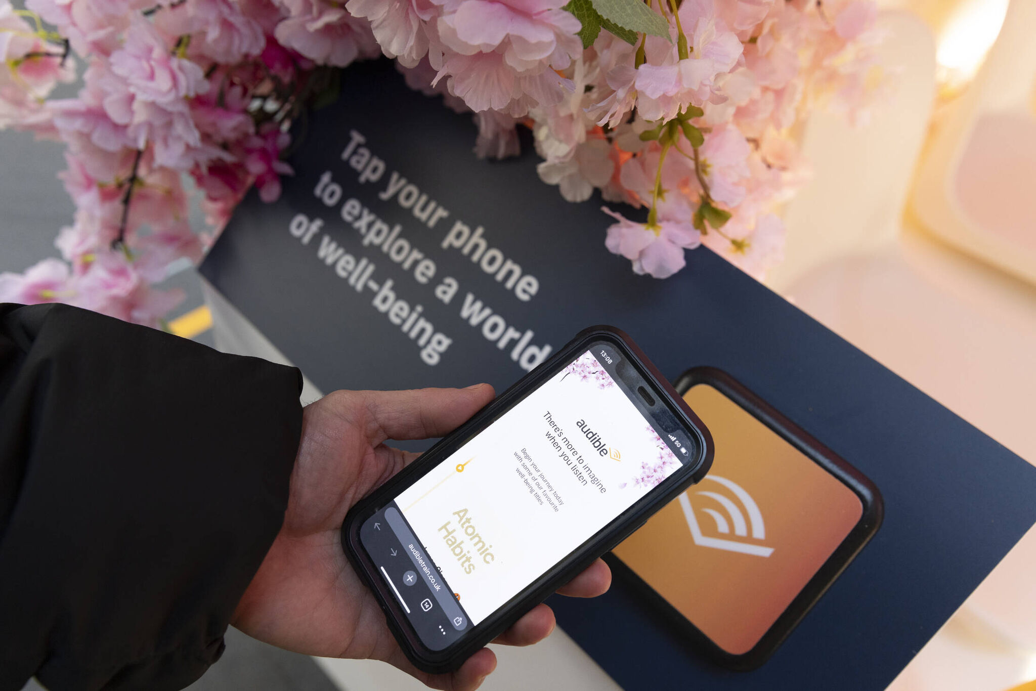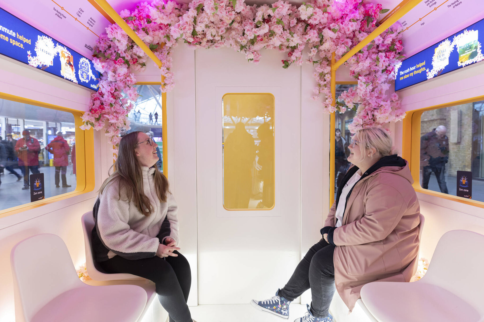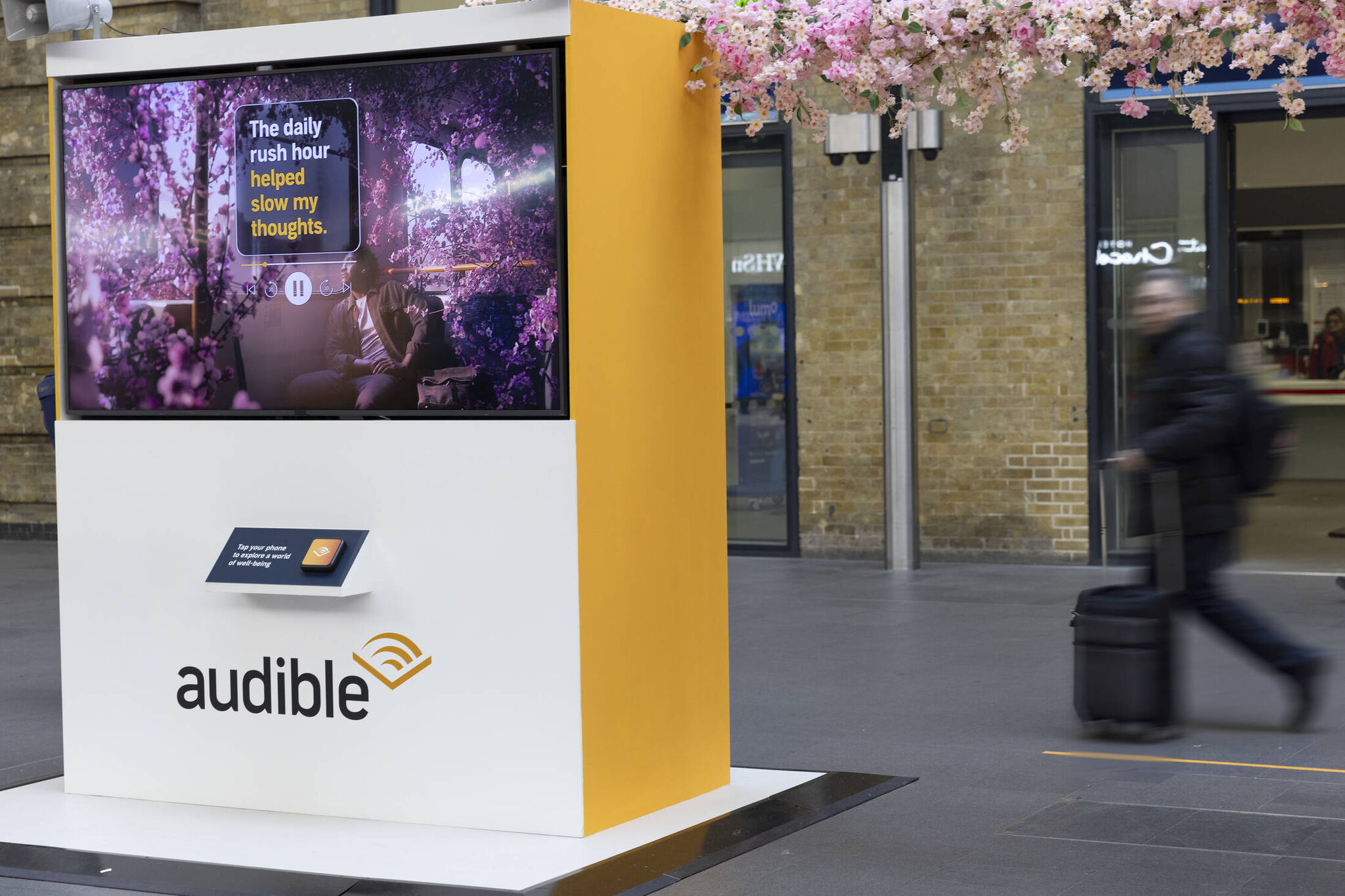 La activación se centró en un vagón de tren que se convirtió en un verdadero refugio de calma en medio del caos cotidiano. Este tren no solo estaba decorado con árboles de cerezo en flor, lo que evocaba la tranquilidad de la naturaleza, sino que se presentó como un espacio completamente distinto a la estación llena de gente y ruido. Al ingresar, los viajeros descubrían un ambiente que invitaba a la desconexión. Con un sonido envolvente proveniente de audiolibros como Atomic Habits y A Quiet Life in Seven Steps, la activación sumergía a los usuarios en una experiencia sensorial única. A través de este vagón zen, Audible llevó a los viajeros a un lugar donde podían olvidarse de la agitada rutina y disfrutar de un descanso mental.