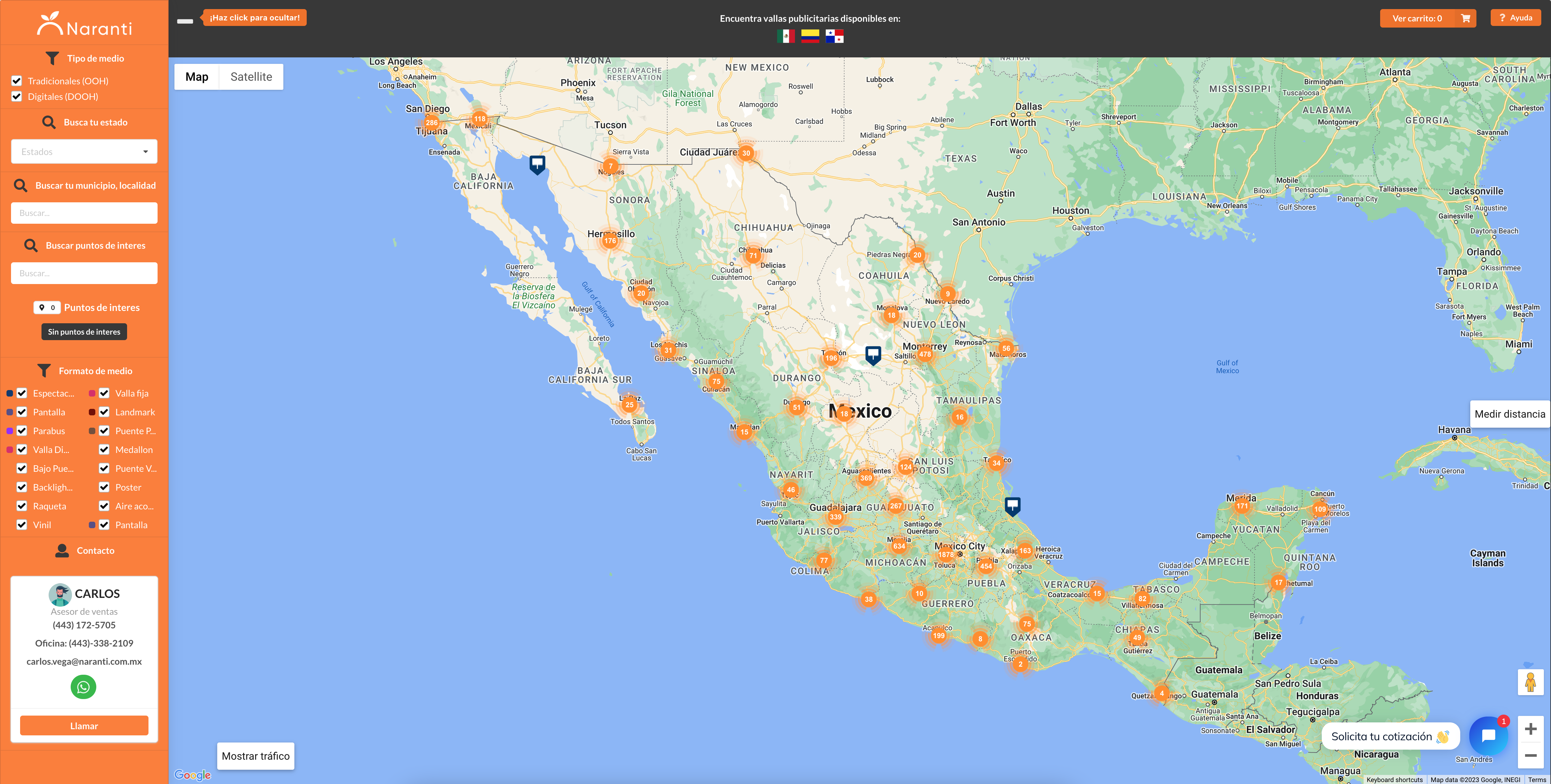 La competitividad en el mercado publicitario es feroz, pero Naranti sobresale gracias a su avanzado sistema de mapeo. Este sistema, actualizado diariamente por nuestro equipo, no solo te permite localizar vallas publicitarias por estado o ciudad, sino que también destaca el número de medios publicitarios disponibles, como pantallas, puentes, espectaculares, mupis y puentes peatonales.