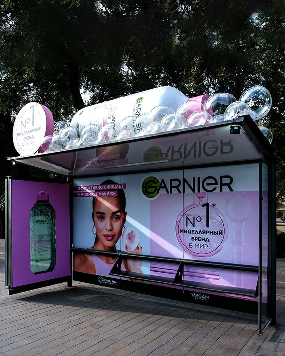 La estructura, que incluye burbujas de agua reales dentro de una vitrina, recrea de manera impresionante el producto. Este enfoque no solo resalta la calidad del agua micelar de Garnier, sino que también refuerza su mensaje de frescura y pureza. Al convertir una parada de autobús en una vitrina de producto, Garnier ha logrado captar la atención de los consumidores de una manera memorable y creativa.