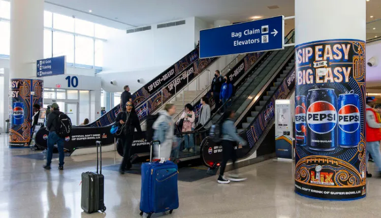 En el Aeropuerto MSY, las marcas no se limitaron a anuncios pequeños; Pepsi, Draft Kings, Budlight y GNC se apoderaron de las pantallas y vallas de la terminal, rodeando a los viajeros con sus mensajes vibrantes. Este tipo de anuncios en lugares de gran tráfico son una forma efectiva de aprovechar la visibilidad del Super Bowl mientras se conecta con una audiencia diversa.