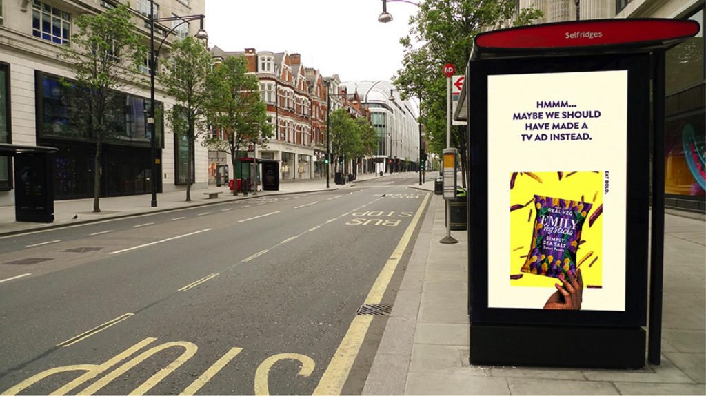 En diciembre de 2019, cuando la gente en Emily Crisps decidieron contratar soportes de publicidad exterior en los parabuses de las calles de Londres, pensando que abril sería la época perfecta para anunciar sus productos, nunca se imaginaron lo que vendría en los próximos meses.