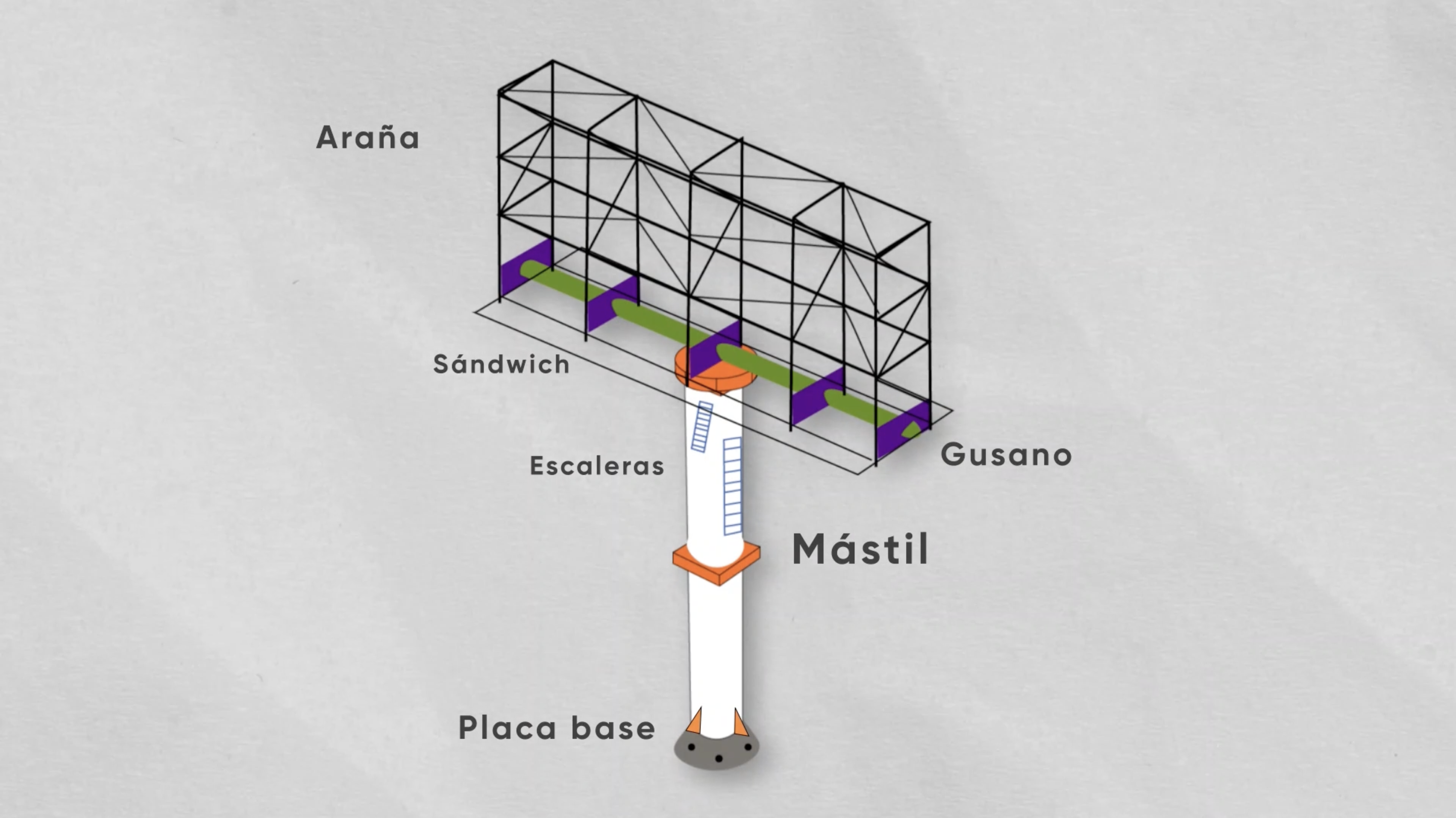 Al final del mástil, antes de llegar al gusano y la araña, se encuentra el "sandwich", una estructura de acero redonda que sirve de soporte para estas estructuras adicionales.