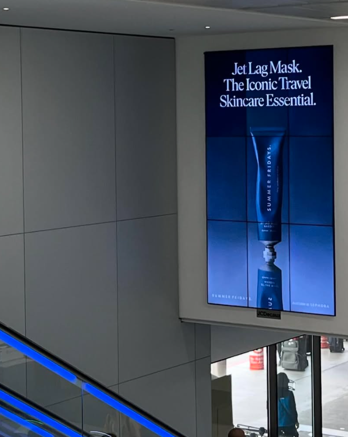 Lo que hizo único este esfuerzo publicitario fue la forma en que se complementó con otros elementos visuales. Además de las bandejas personalizadas, Summer Fridays también colocó anuncios en las pantallas digitales del Aeropuerto Internacional de Los Ángeles (LAX). Estas pantallas, estratégicamente ubicadas en áreas de alto tráfico, reforzaron la presencia de la marca y aumentaron la probabilidad de que los viajeros recordaran su mensaje. Este enfoque multifacético maximizó el alcance y creó una experiencia publicitaria coherente y memorable.